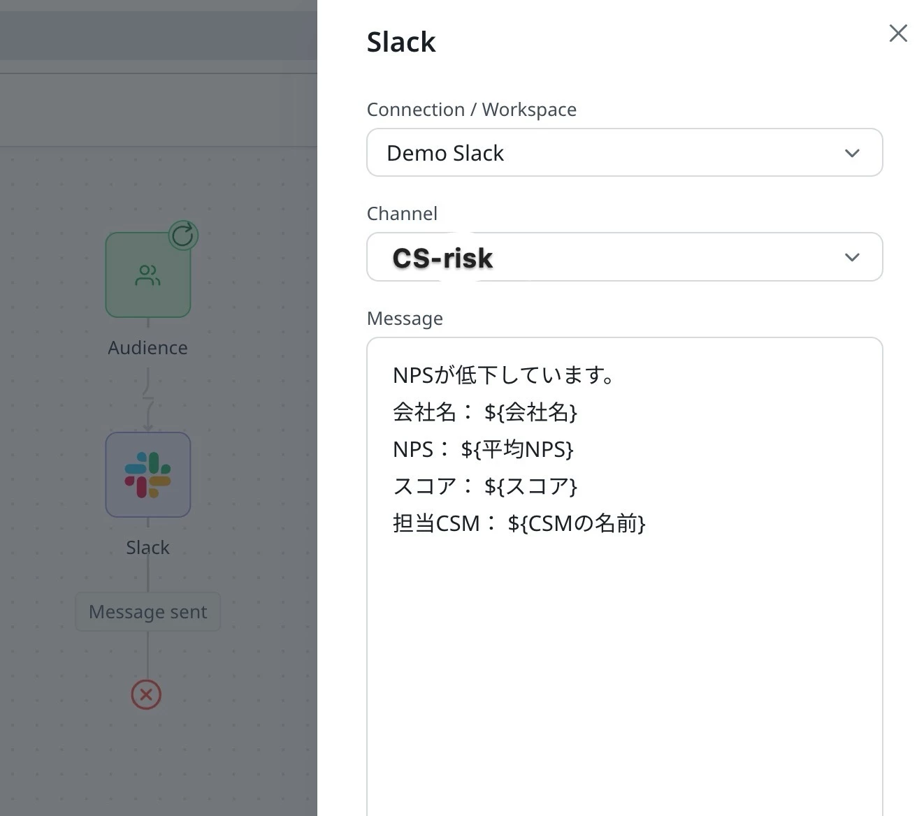 ジャーニーの中に入ったアイコンをダブルクリックし、ワークスペース、チャネルを設定し、投稿したいメッセージを作成します。