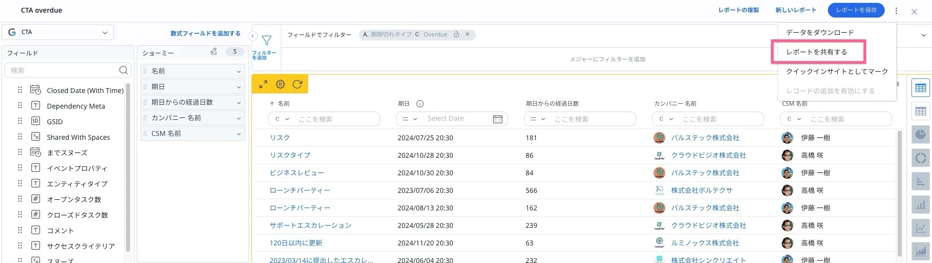 レポートもダッシュボード同様に個々のレポートを共有することができます。