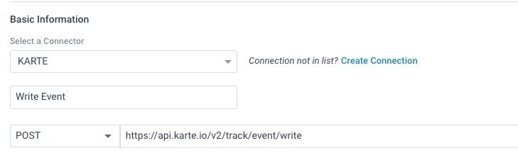 方式はPOST、URLはhttps://api.karte.io/v2/track/event/write を指定します。