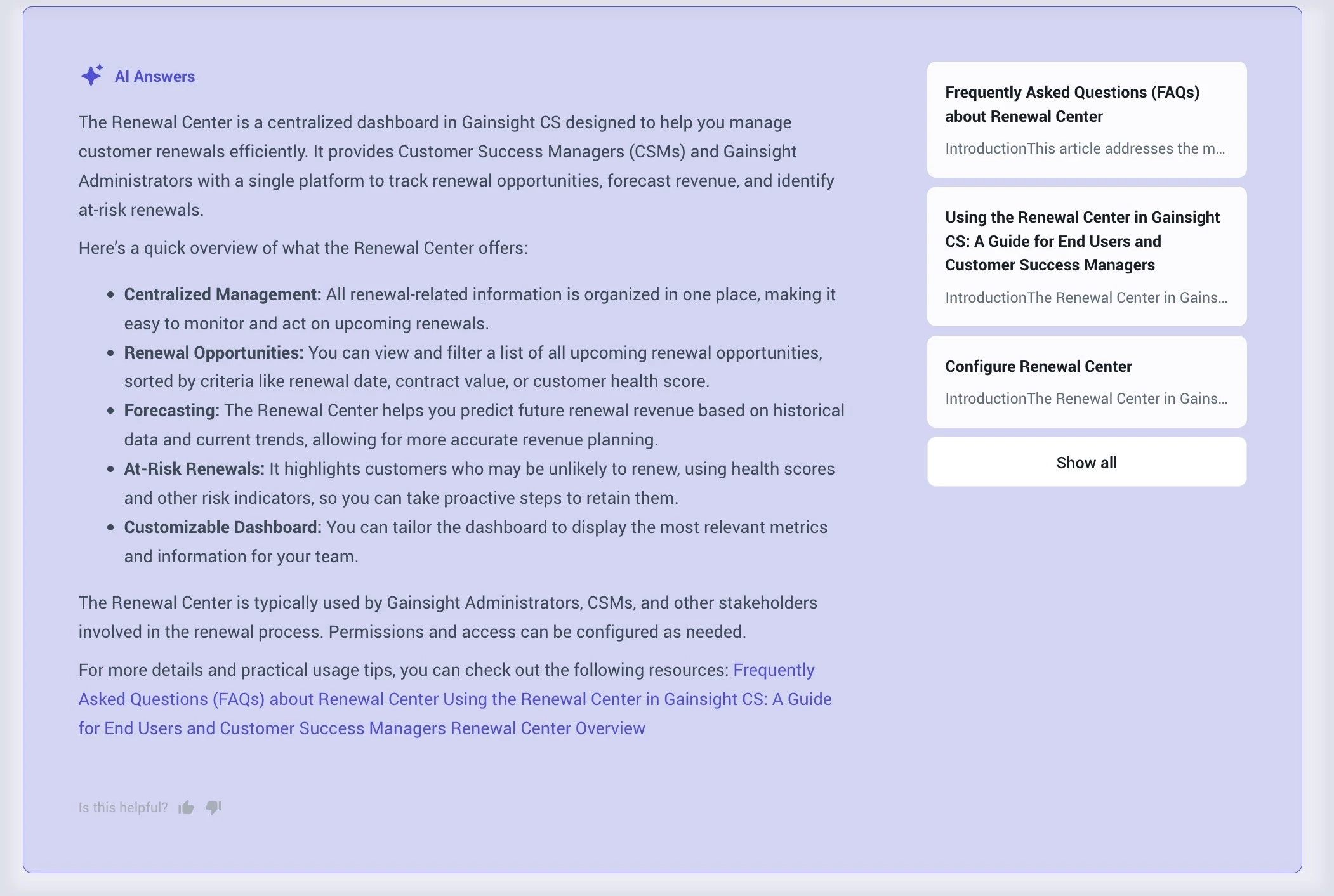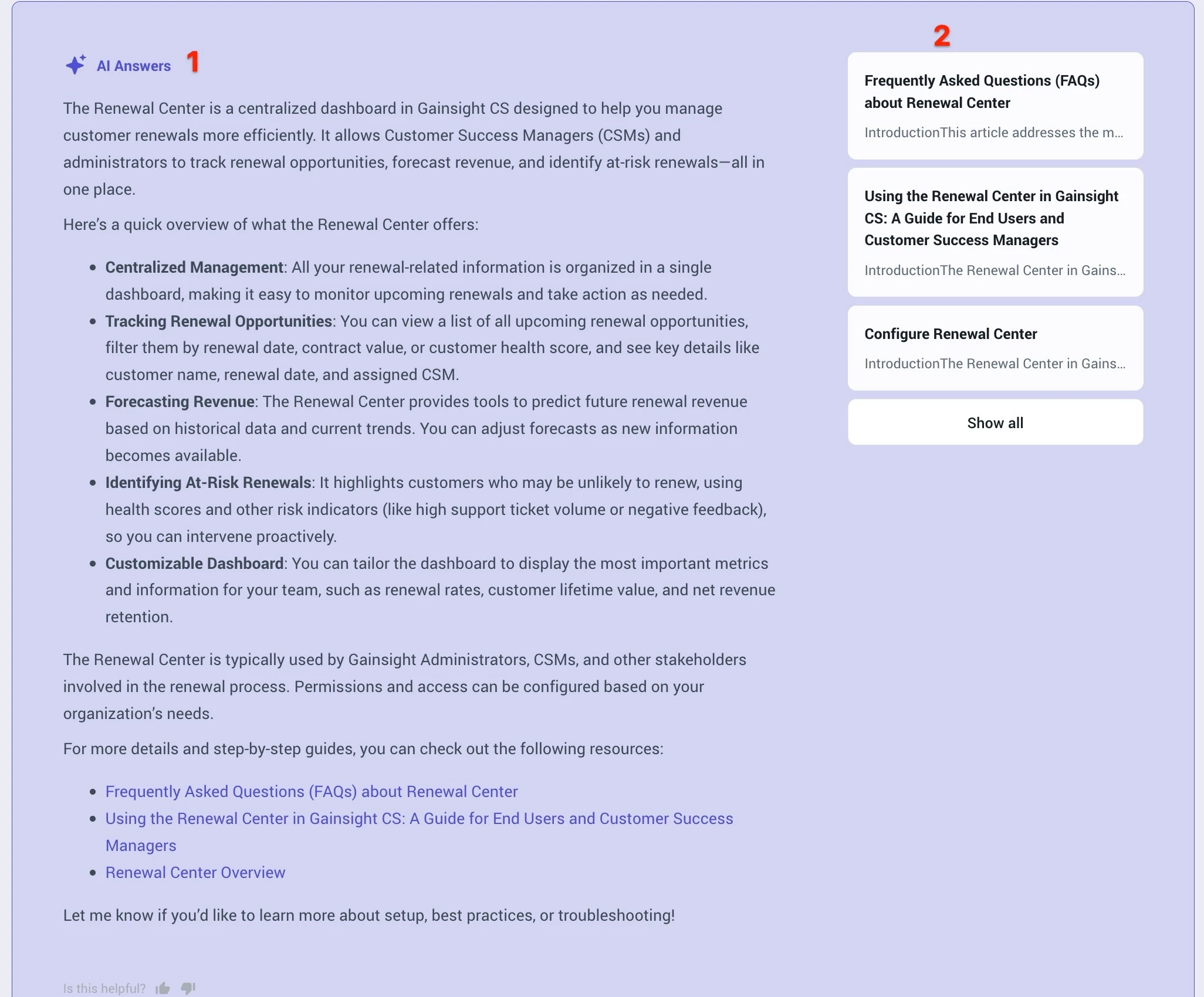 - AI Answers Panel: Displays the AI-generated response synthesized from community posts, product documentation, and other federated content.