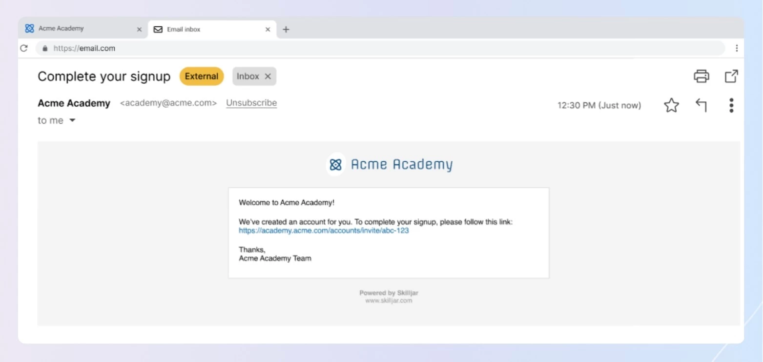 Enable an organization-level email verification setting that requires new learners signing up with email/password to confirm their email via a secure link before accessing training, helping reduce spam, strengthen security, and support compliance standards like EU Double Opt-In. The feature uses Skilljar's existing invite workflow and applies only to new self-signups.