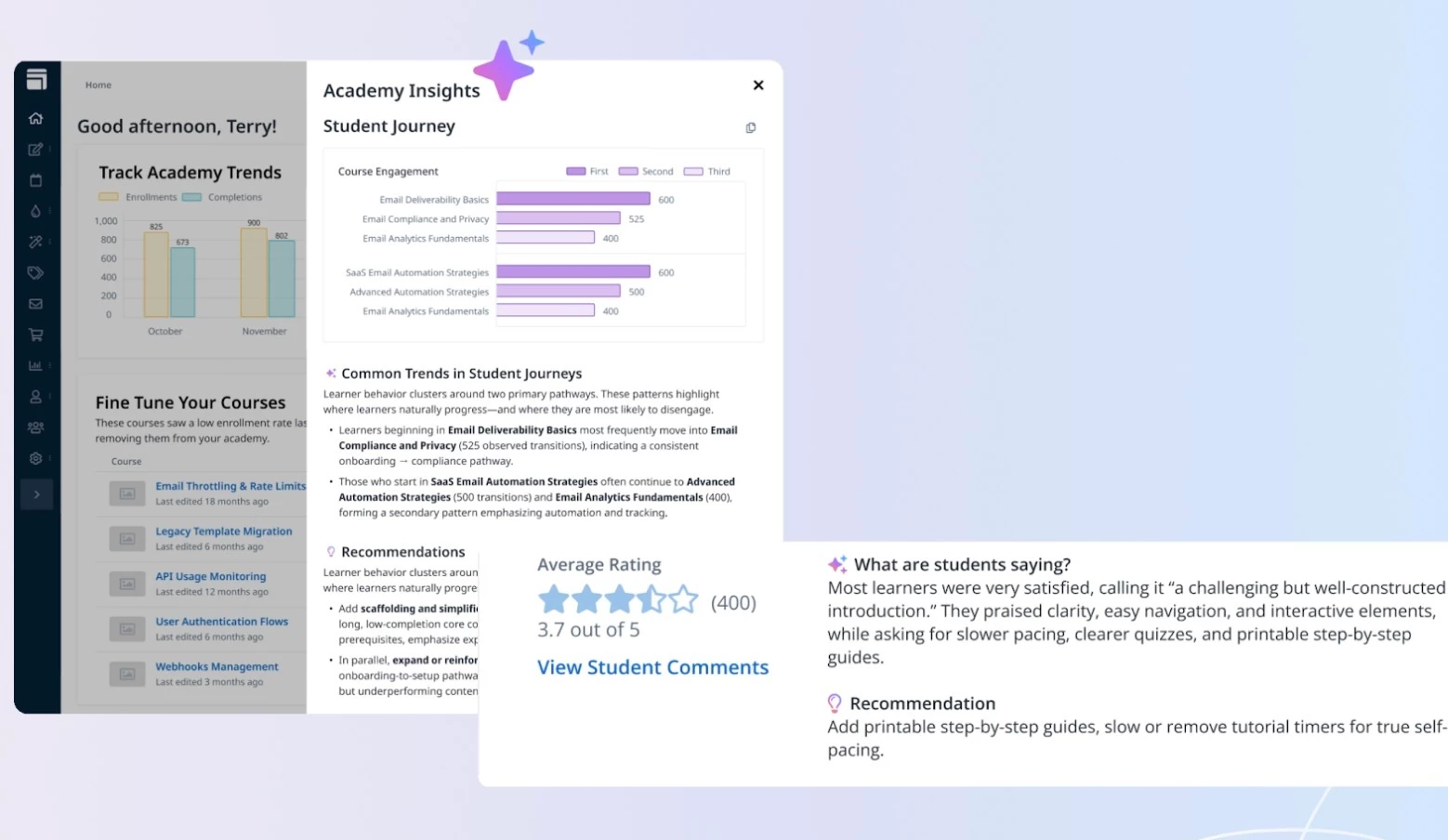 We've added AI-powered features to Course Ratings and the Dashboard Homepage, giving admins instant summaries of learner feedback themes and real-time insights into engagement trends and learning paths. Additionally, AI Tutor beta has been extended to all customers, featuring improved content guardrails. Note: AI Tutor requires enablement in your dashboard settings before it's visible to learners.
