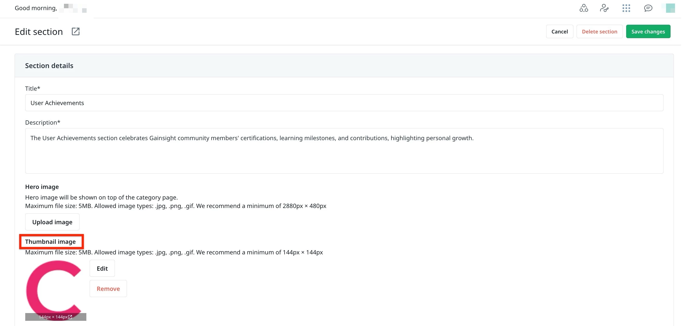 - (Optional) Thumbnail image: Upload a thumbnail image as per the defined criteria. The thumbnail images appear on the section pages in the community.