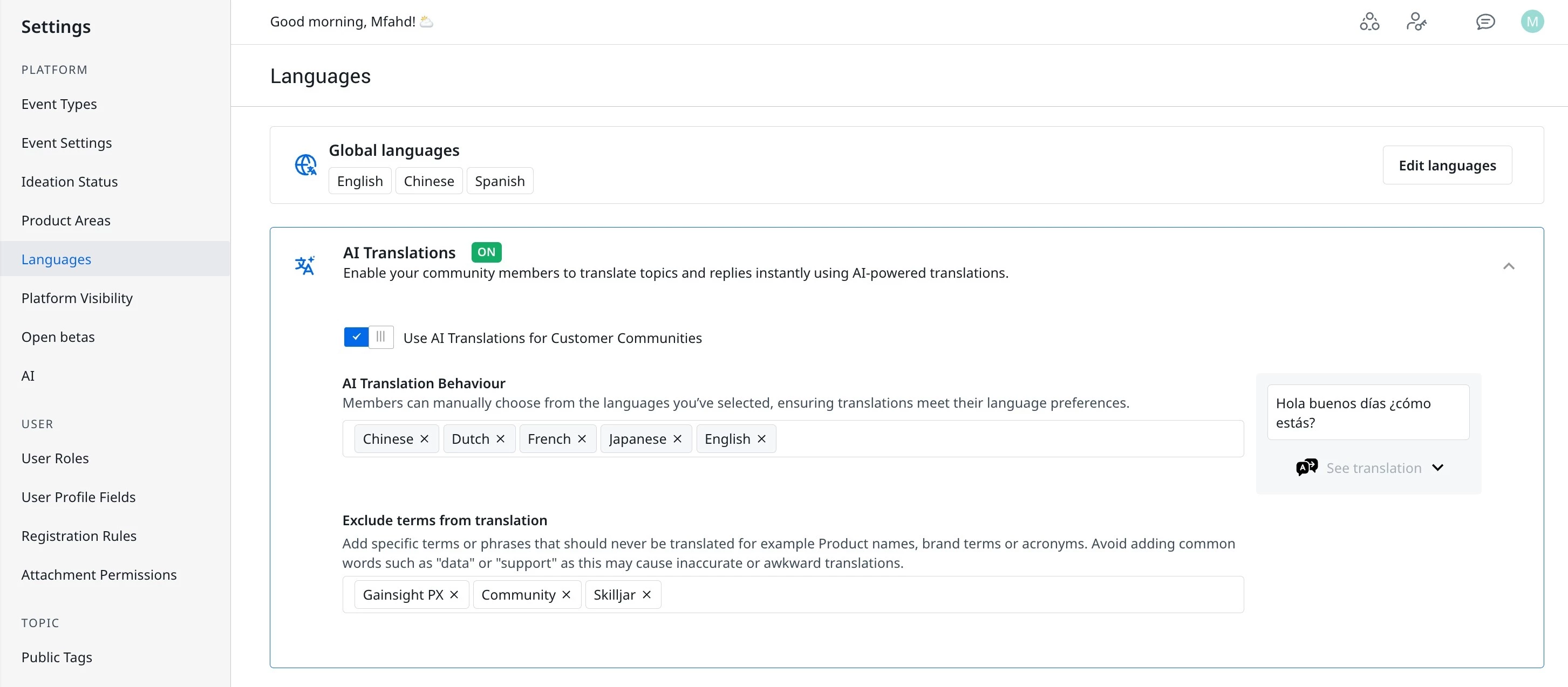 AI Translations is officially out of beta and now available as an add-on for all Gainsight Communities. Members can instantly translate community topics and replies into their preferred language, creating a more inclusive, globally connected experience.