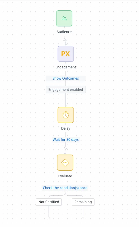 Our goal is that we would like to send them a second nudge via email N days later if they have still not completed their certification. I added a delay step followed by an evaluate step that includes Course Name and Course Completion.