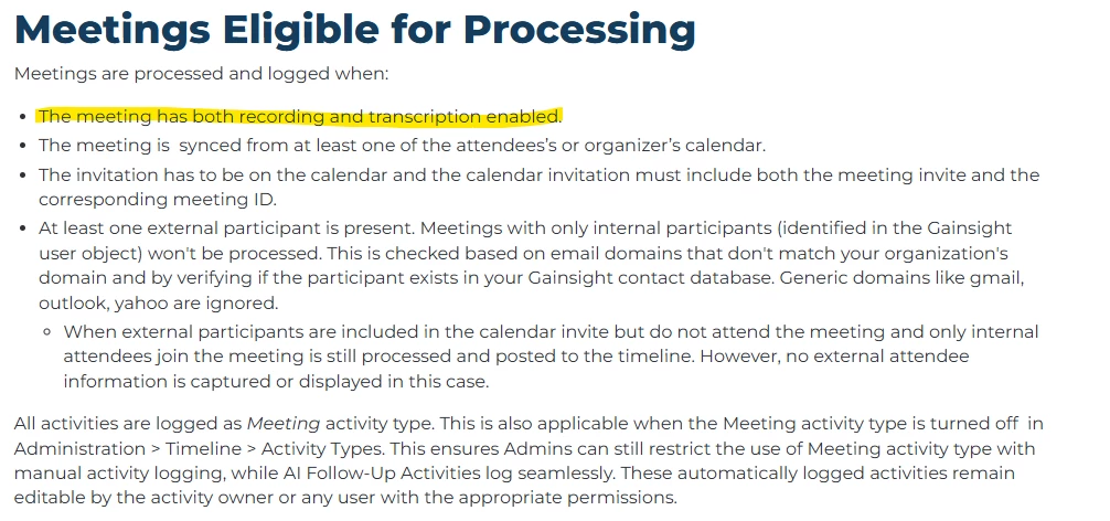 We are noticing meetings coming into our Gainsight Timeline through Microsoft Teams AI Follow Up that do not have have recording and transcription turned on. Is this an error or is this documentation inaccurate? It states that you need both recording and transcription turned on.