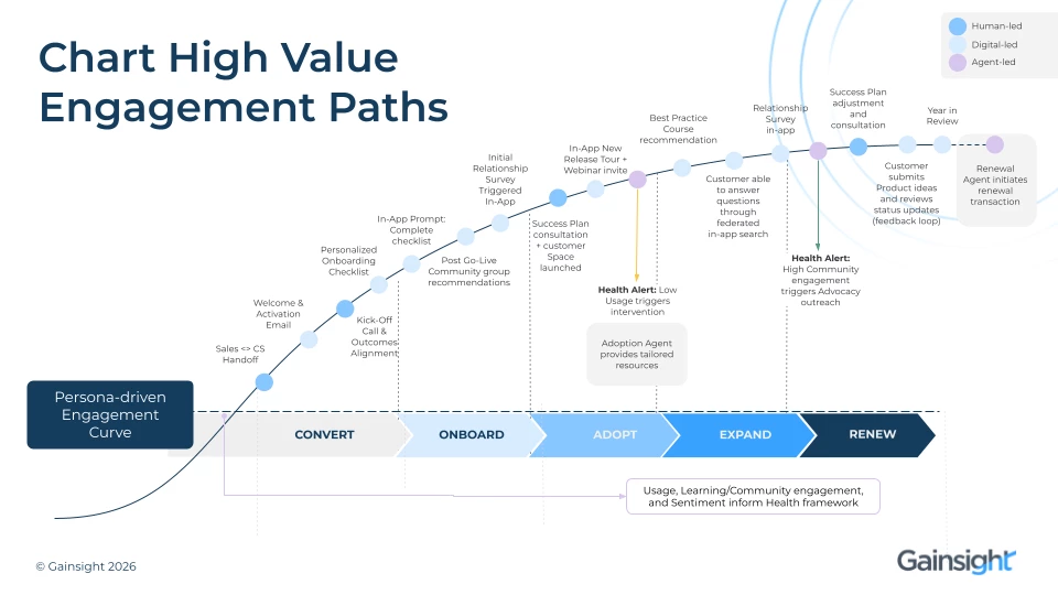 CS today is about outcomes (not activity), which means how you're blending human and digital touchpoints in Gainsight may start to evolve. To do that, map the customer journey and intentionally decide where human, digital, and agent-led engagement should happen.