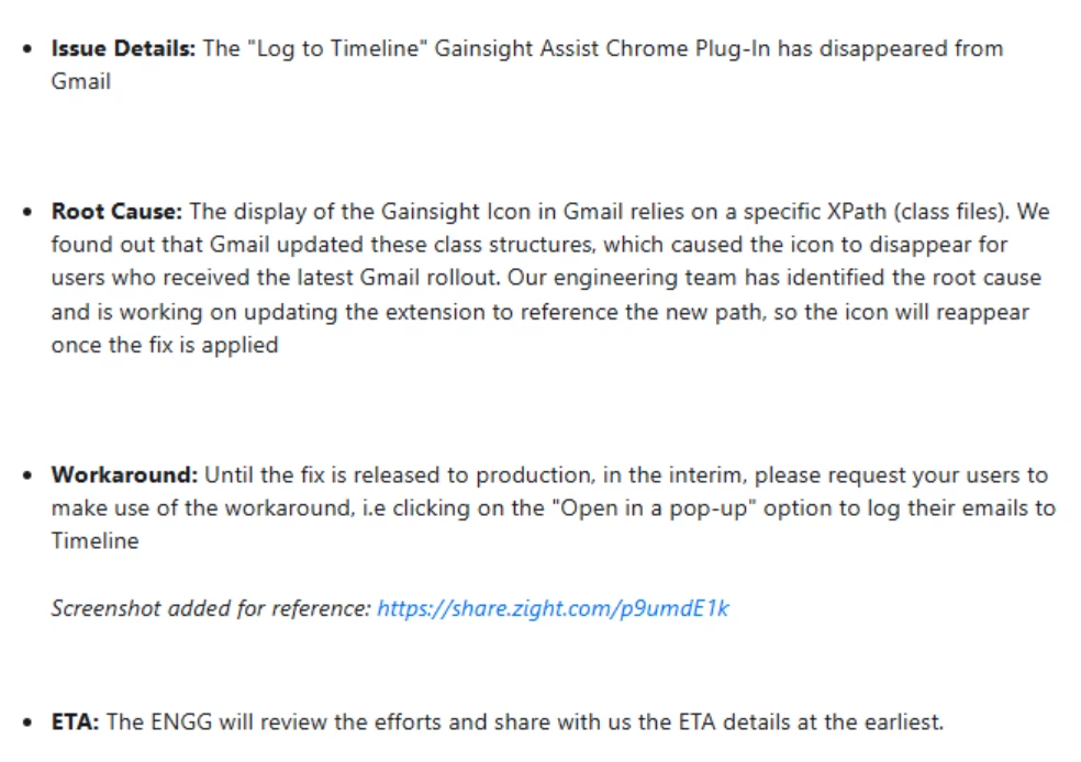 Anyone else seeing issues with the Gainsight Assist Chrome plug in/app? Our CSM’s cannot connect their emails-it’s either not working at all, or it appears like it’s working for sending an email the first time, but it’s not appearing after that for any replies to emails. Submitted a support ticket, but looking for more info to help my team. Not having emails go to the timeline is a big issue for us.