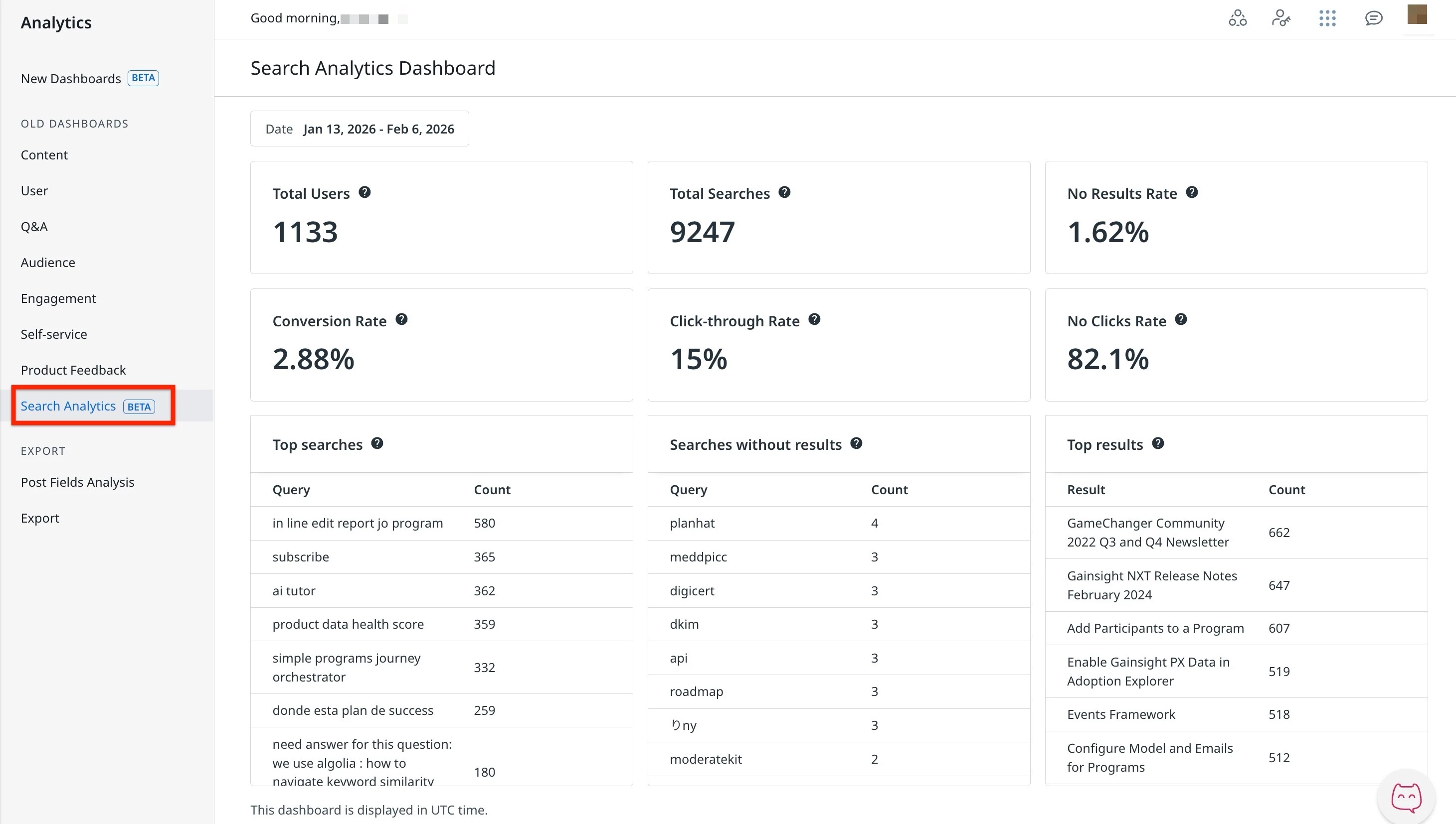 The Search Analytics dashboard provides admins and community managers with visibility into how users interact with search. It helps you understand search usage, evaluate search performance, and identify opportunities to improve the overall search experience.