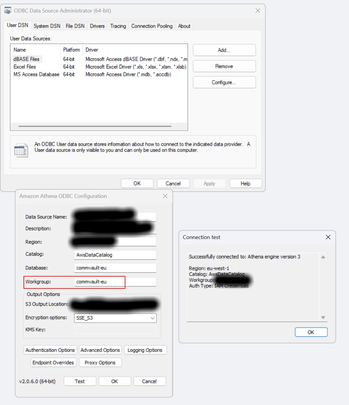 - At the bottom of the Amazon Athena ODBC Configuration dialog box, choose Test. If the client computer connects successfully to Amazon Athena, the Connection test box reports Connection successful. If not, the box reports Connection failed with corresponding error information