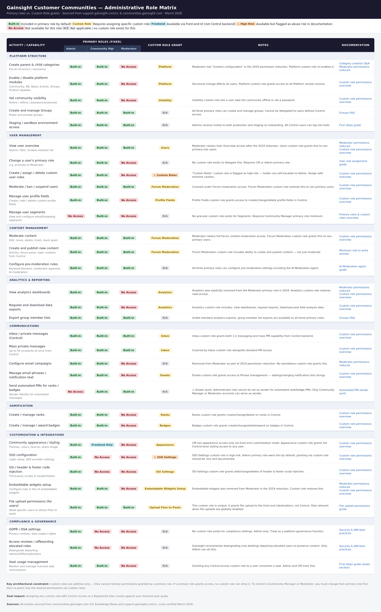From where I’m sitting right now, if this matrix is accurate, the Community Manager role has way too much access to more Administrative functions such: