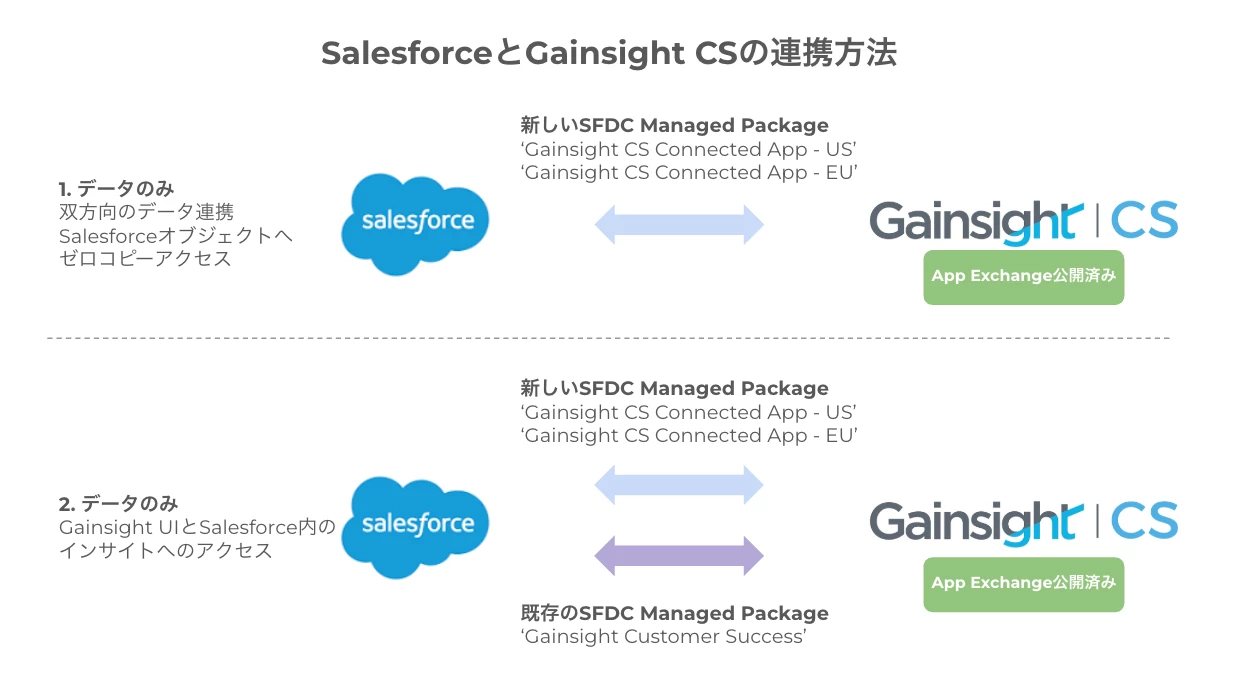 - Gainsightとセールスフォース間のデータ統合とUI統合の両方を使用する