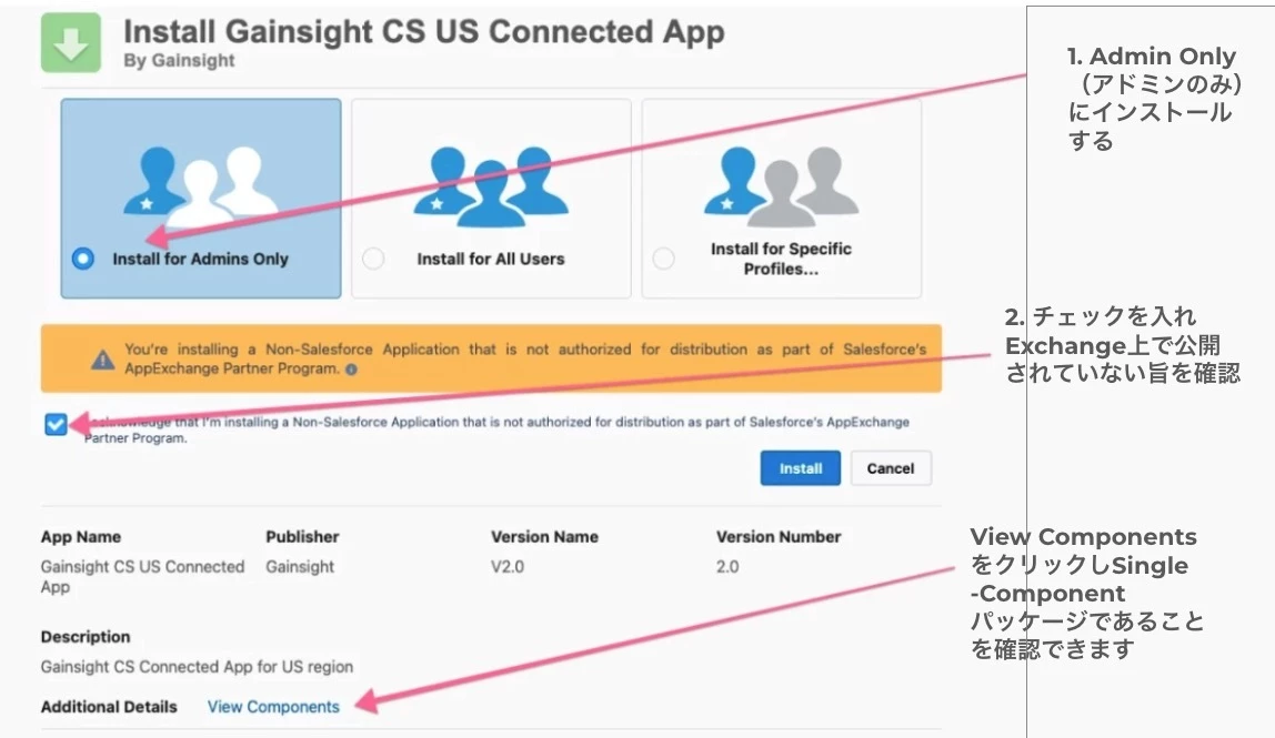 推奨オプション:Gainsight Salesforceコネクタの補完として、Gainsightの新しいSalesforce向けマネージドパッケージをインストールしてください。注記:このマネージドパッケージは調査の一環としてSalesforceによる審査済みですが、現時点ではAppExchangeに掲載されていません。近日中に公開される見込みです。公開までは、マネージドパッケージのインストール時に以下のメッセージが表示されます: