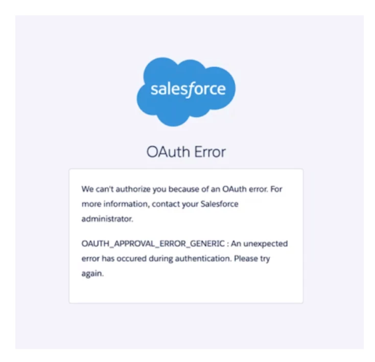 [代替方法] 新しいマネージドパッケージをインストールせずに再認証する方法:接続用の既存Salesforce OAuthユーザーに追加権限を付与する。 SalesforceのOAuthユーザー権限要件が最近変更されたため、既存のOAuthユーザーが再認証を試みるとエラーメッセージが表示される場合があります。例を以下に示します: