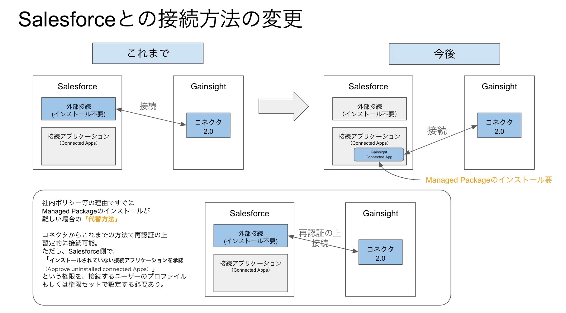 GainsightとSalesforceの間の接続方法が以下のように変わります。それに伴いManaged Packageのインストールが必要となります。すぐにパッケージのインストールが難しいという場合は、[代替方法]をご参照ください。
