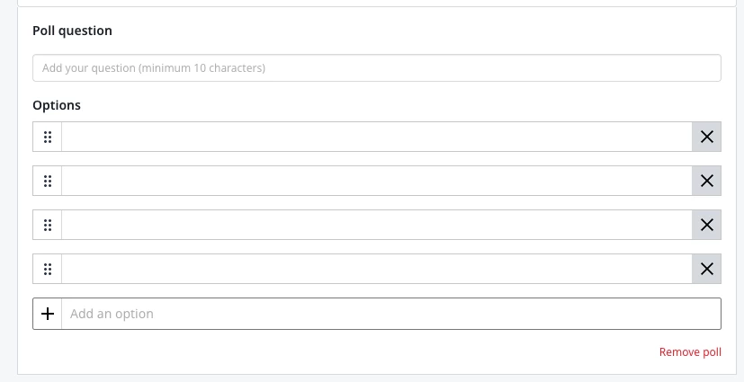 Hello GS! I would like to please recommend the ability to add an additional option to a poll after the post is created. At the moment there is not a way to add an additional option. This causes us to delete the post and create another post. Ideally, this would not have to happen. Thank you for the consideration!