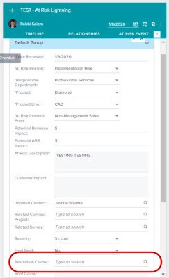 In Gainsight, a CSM added an owner to an "At Risk Event" linked to a Risk CTA. She searched for the internal employee's name in the Resolution Owner field, but two instances of the name appeared. She clicked on the first one, not knowing it was for a customer contact vs an internal contact.