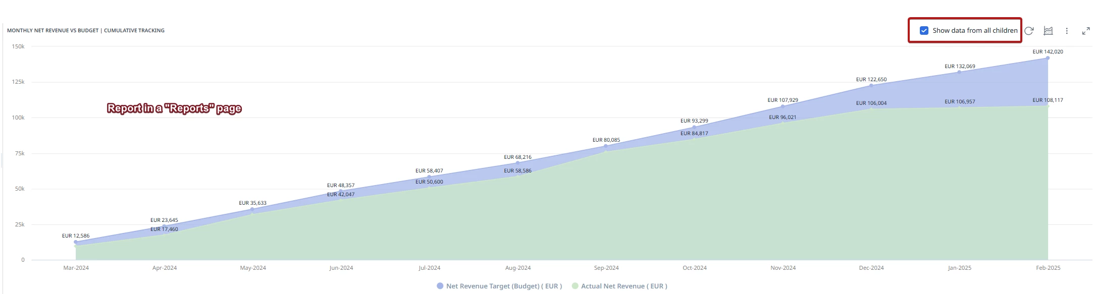 There is a very useful checkbox “Show data from all children” on all reports in C360, that are added to a “Report” type C360 page. It allows to see data accumulative with all child accounts, which in our business is often a must.