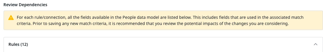 When multiple match criteria exist in the People admin but at the different ingestion points(rules, connectors) the admin had made certain preference and enabled only a subset of the criteria, then, the system will not include the newly added criteria by default to maintain the preferential selection made by the admin. In such cases, the admins will have to enable the newly added criteria for the rules/connectors of their choice.
