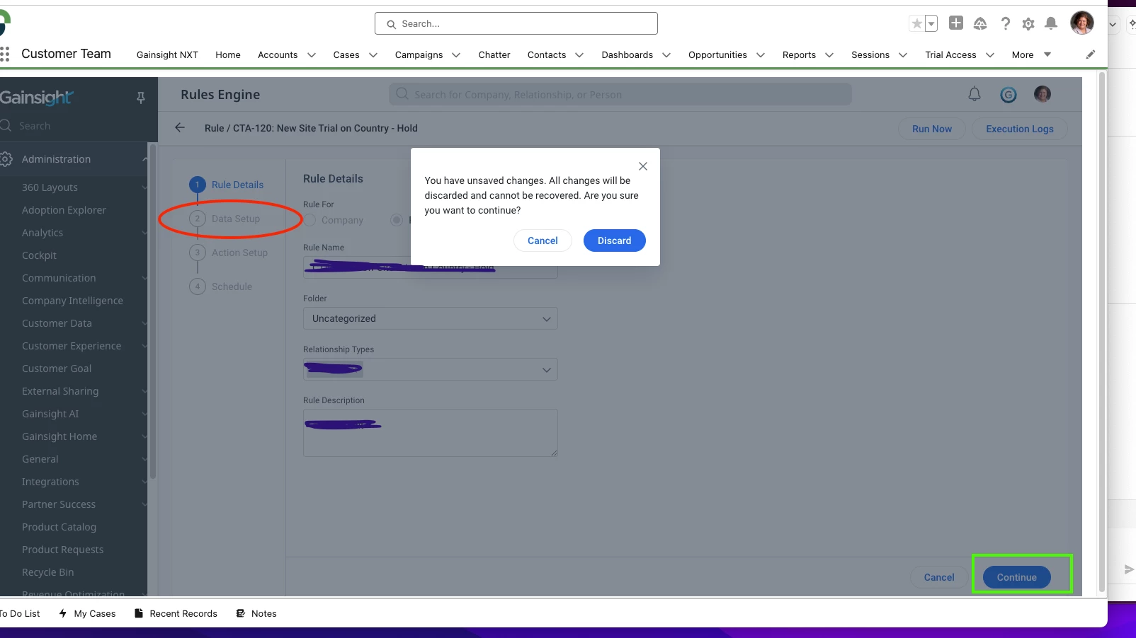 In the below screenshot, if you make a change and click the red circle to proceed to data setup, you get the error your changes are not saved. Instead, we have to press the Continue Button at the bottom right. Nothing says Save anywhere. This “gets me” every time. Can we just auto-save these changes? I never make changes here and proceed work with the intention of it being discarded.