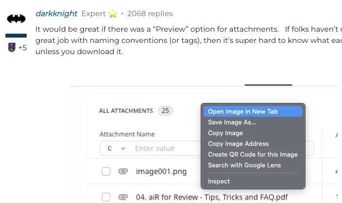 It would be great if there was a “Preview” option for attachments. If folks haven’t done a great job with naming conventions (or tags), then it's super hard to know what each is unless you download it.