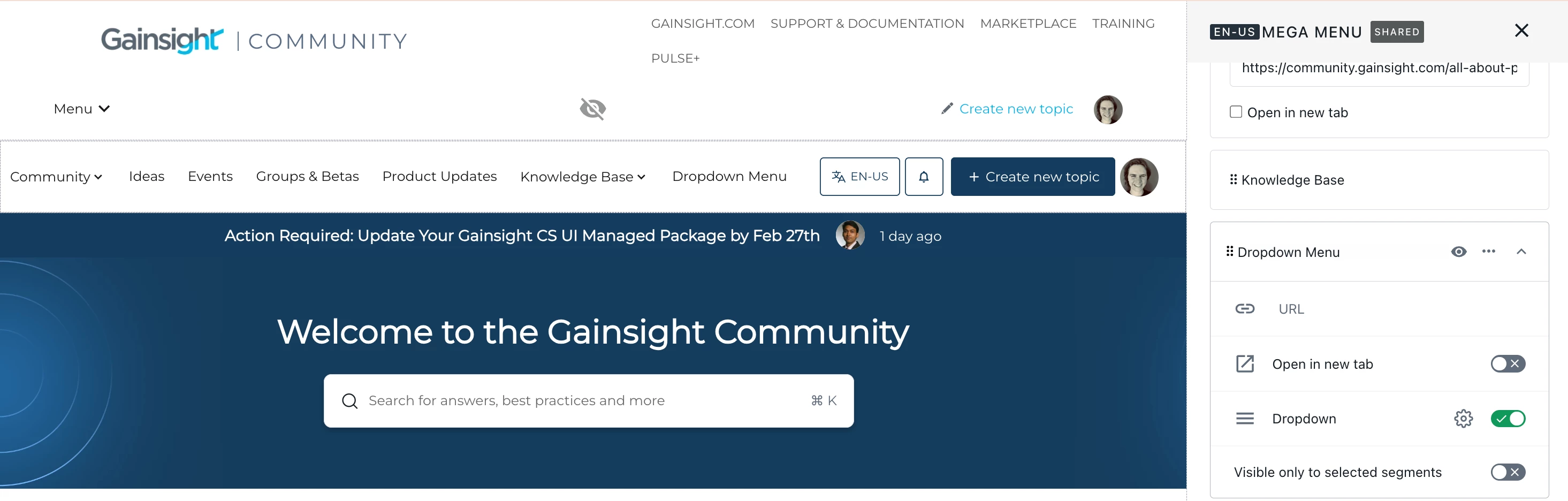 We're currently implementing Gainsight Communities and would love the ability to create a dropdown menu in the navigation bar for quick access to external resources like our partner portal, blog, etc.
