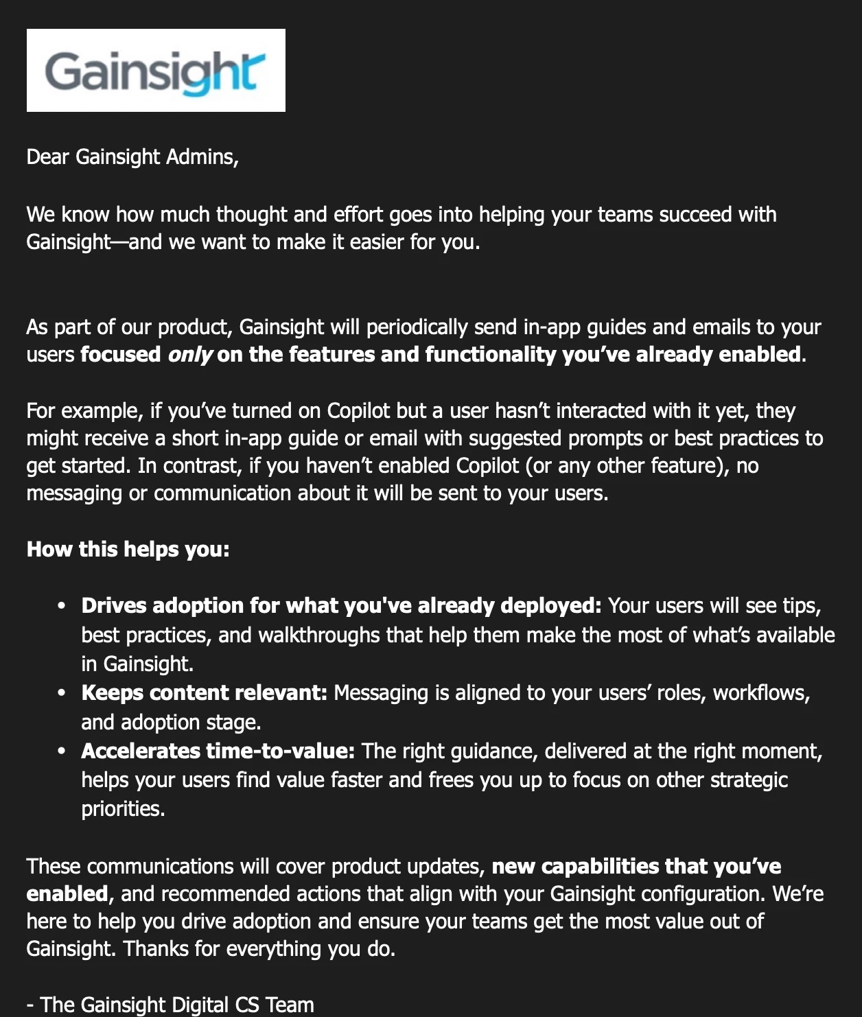 Disagree. If Gainsight is going to start flooding my end users with in-app messages, I absolutely want to be informed before they do so that I can register my strongest opposition to it. This is exactly the type of email I want to receive from Gainsight - just not the BS marketing stuff.