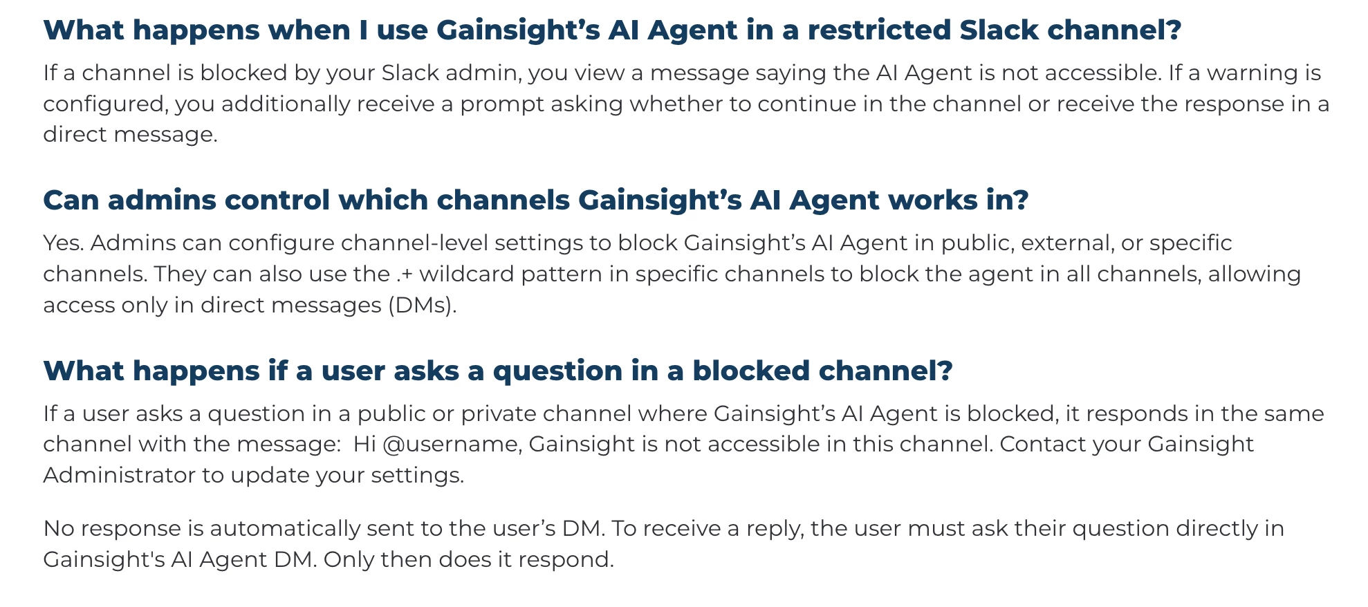 Case in point: the new Slack AI agent. This particular feature required a very lengthy security and legal review prior to getting approval to even begin testing. During this time, we had end users who found out about the feature and submitted requests to our security, legal, and ops teams to enable the feature, despite the fact that I was already involved in the approval process. As part of the approval process, we had to validate for our legal and security teams that certain security and data control methods were in place, such as the Wildcard channel blocking option which was previously not stated in FAQs.