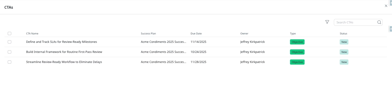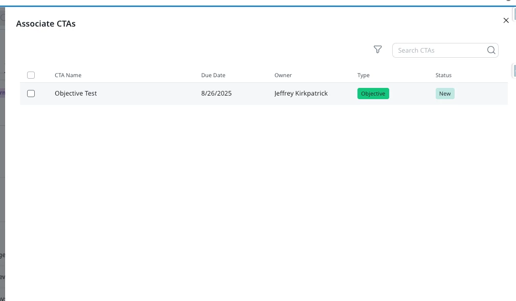 Right now, it only consists of “CTA Name, Due Date, Owner, Type and Status. But giving admins the ability to customize these columns for specific fields (both standard and/or custom, i..e Reason or Objective Category, Product or Feature, etc) that matter to their business would help make it easier for users to identify what CTAs to link.