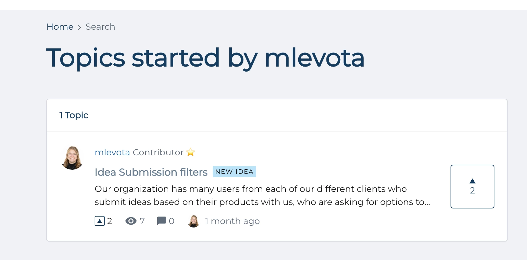 Our organization has many users from each of our different clients who submit ideas based on their products with us, who are asking for options to be able to filter the Ideas page beyond just ‘by product’ and ‘by Idea status”. Specifically, if there can be a filter added of ‘my ideas submitted’ to view just those in a similar way a user can look at their topics