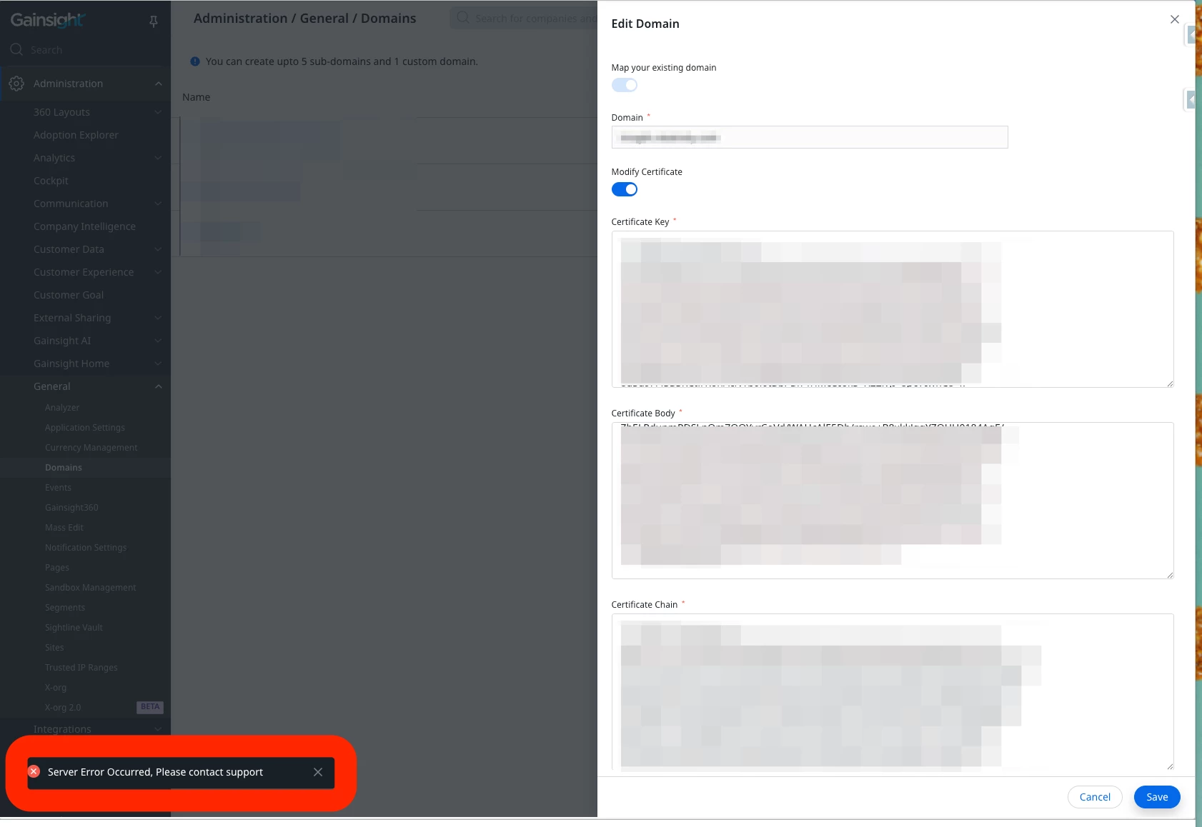 When attempting to renew a domain cert, I got an error “Server Error Occurred, Please Contact Support.”