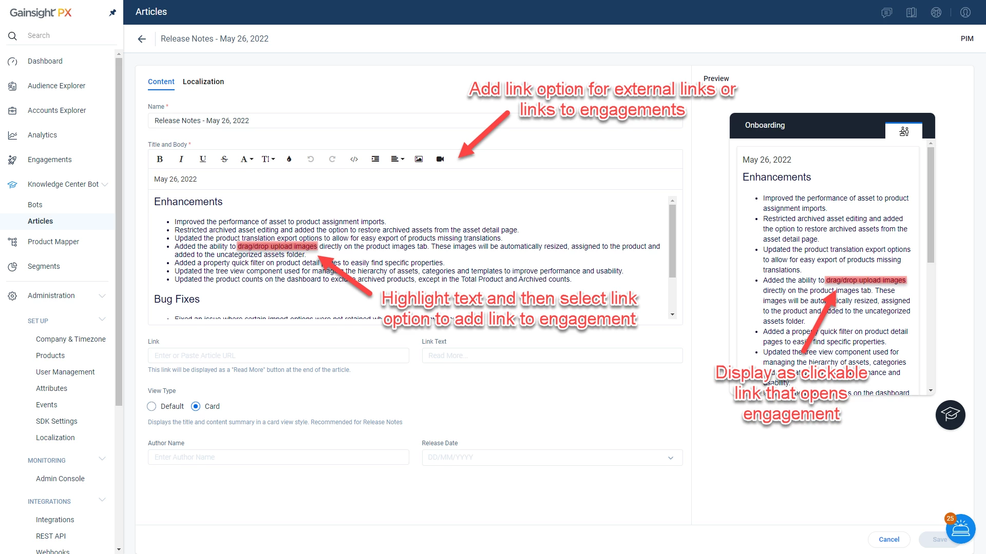 We are using the KC Bot to display release notes using articles. The release notes will be simple bullet list items of new features, but sometimes we will want to have rich content with more information about new features. It would be nice to allow users to open these engagements from within the release notes article with either some of the release note text as a link or a “See more!” link.
