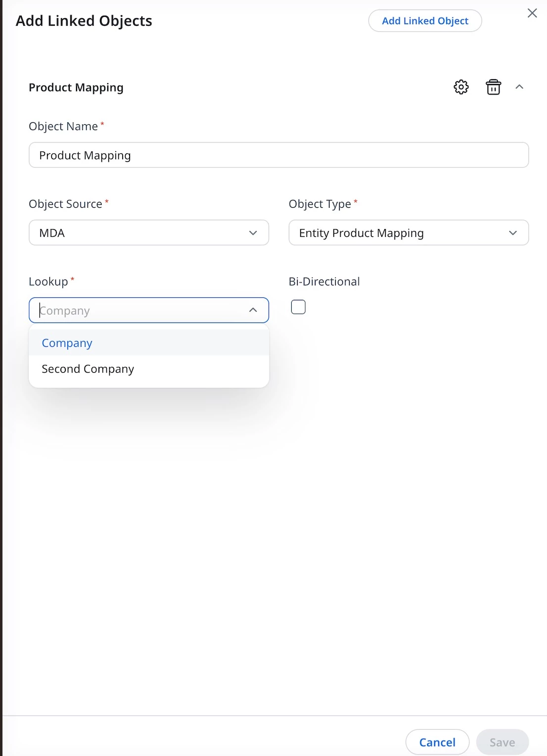 When configuring a linked object, the Admin can select a lookup field from the linked object, and this selection is intentionally restricted to Company-level fields.