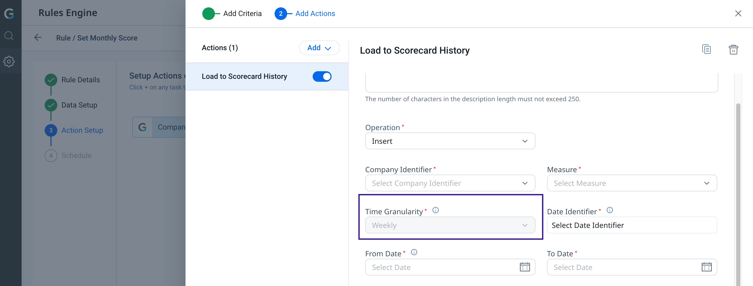 Currently through Load to Scorecard History Action, only weekly snapshot data can be loaded as the Time Granularity is set to Weekly by default and is uneditable.
