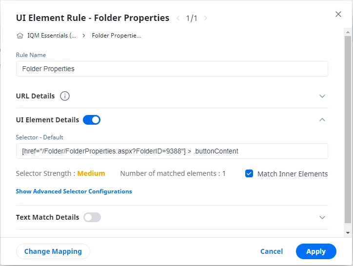 Similar to how Product Mapper URL rules have wildcards it would be nice to have wildcards for UI Element rules. When evaluating the selector it might be such that a UI object has a dynamically created ID and we would want to capture any of the objects of this type.