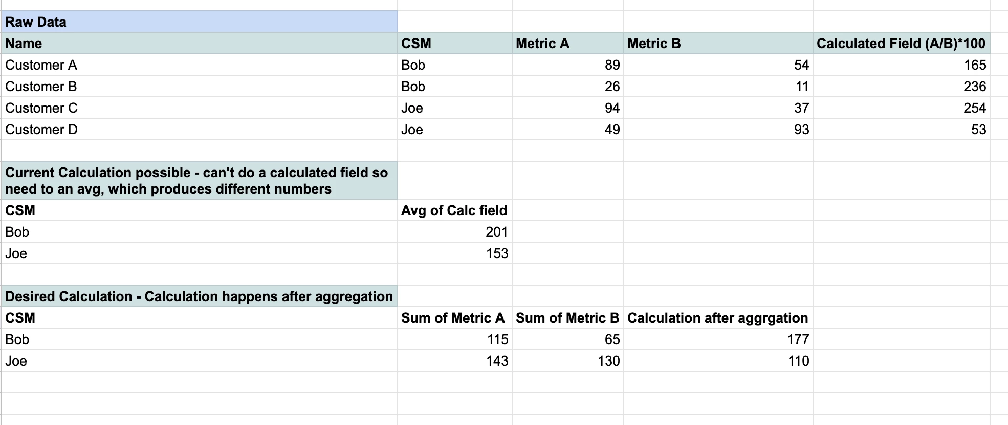Workaround: For any metrics that needs to be calcuated by a different aggregation (CSM, Region, Sub Region, Country, and more) we will have to build individual data designers to show the correct number. This solution also prevents us from having drill downs that let you drill down into the company data within a certain data point. We will need to have one report for the aggregation and then a table next to it for the company row level data. This is not scalable.…