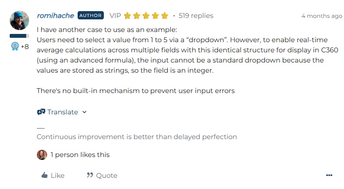 Instead of using picklists for everything, I feel it’d be useful if we could limit the input range in integer fields.