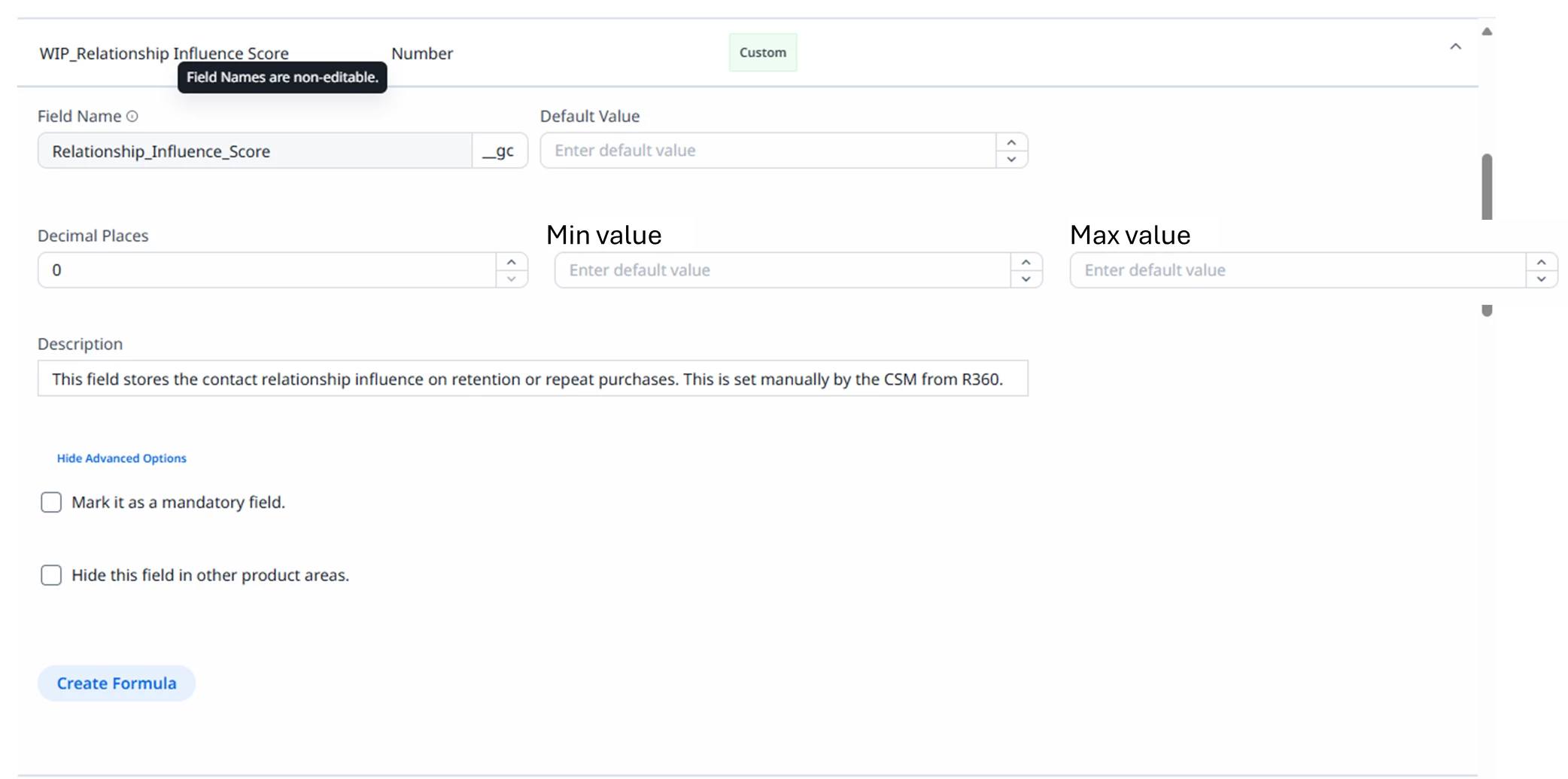 Instead of using a picklist to force CSMs to pick a value between 0 and 5 R360 > People, and then having to use silly case statements in a rule to populate ANOTHER “hidden” integer field in our calculation, we’d like them to be able to just type in the number or use arrows to decrease or increase the previously set value without being able to go above or below the specified range.