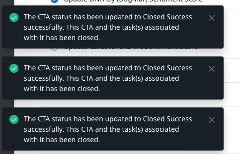 When completing CTAs in bulk, individual confirmation boxes are created which is a needlessly annoying user experience. It would make it less obstructive and jarring if there was a single pop-up box for all (and no information would be lost as they say the same thing)