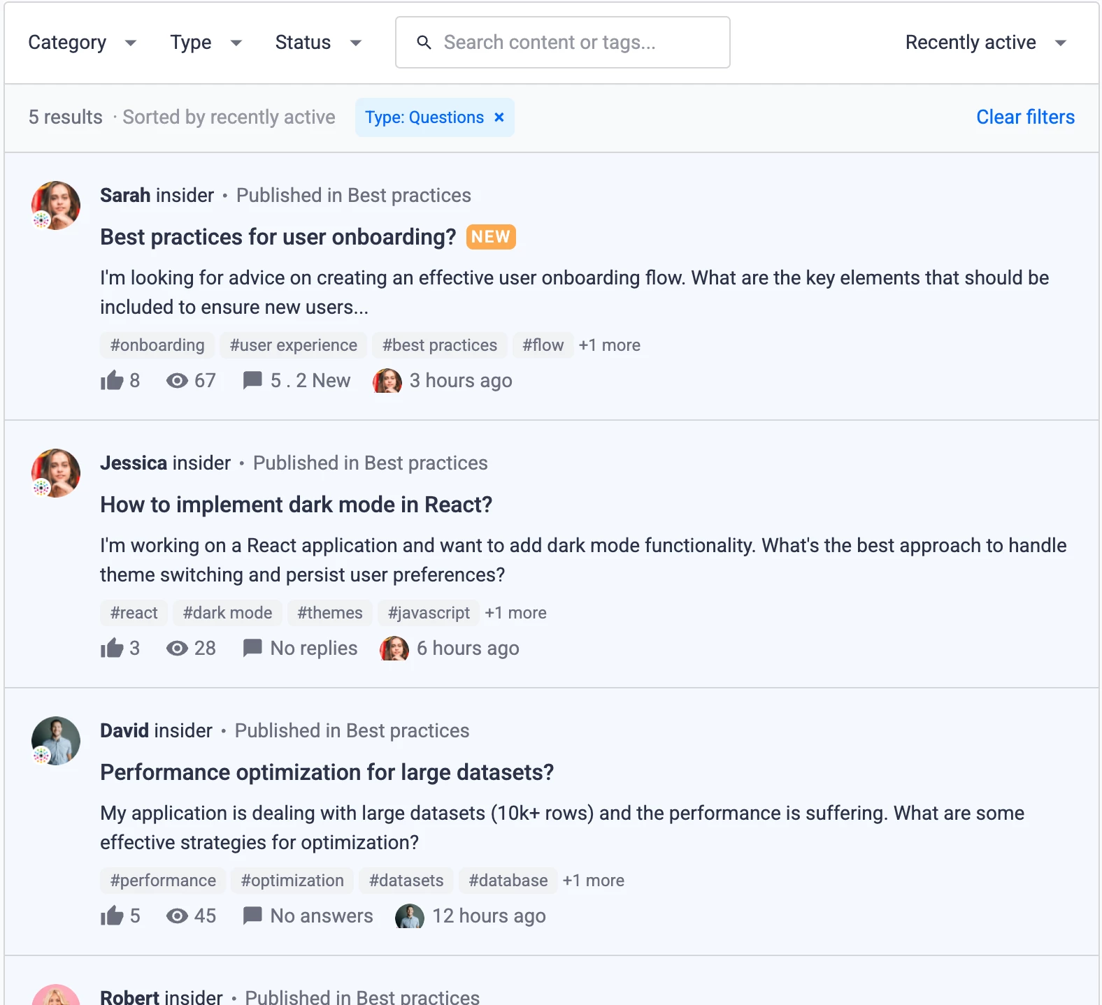 I need a way to help our employees find the questions that need a reply or a best answer from the front end.