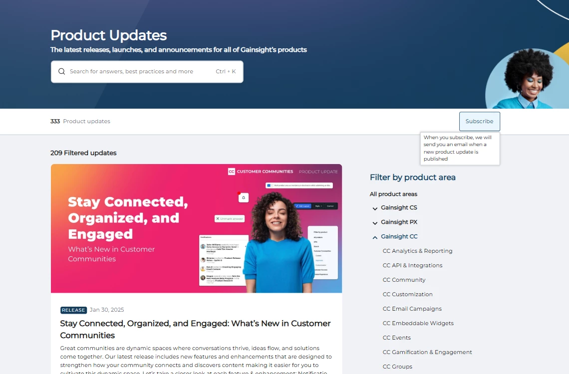 Our platform contains 6 products, each of which requires specific product updates that are not applicable to all customers. What we'd like to see (and this may have already been addressed in the many comments above) is the ability for our users to subscribe by product area rather than to the entire Product Updates page as a whole. For instance, in the Gainsight example, we would like users to receive email updates about Gainsight CC specifically, rather than the entire collection of 333 product updates that includes Gainsight CS, PX, etc.