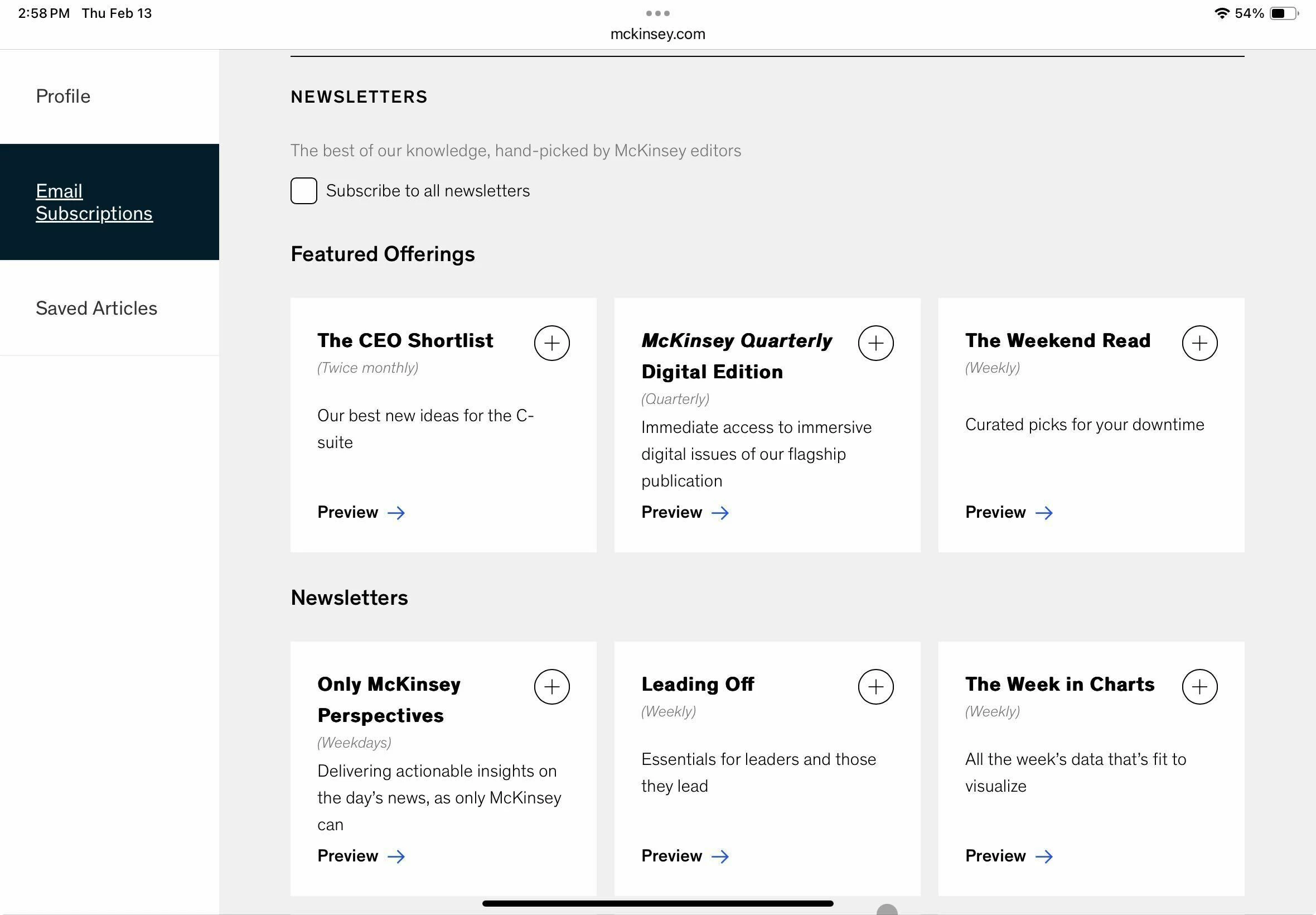 Mckinsey & Co has had (for years) what I consider to be one of the absolute BEST subscription center, hands down. Individual subscription options, and they tell you how frequently (or what days) you’ll receive each newsletter.
