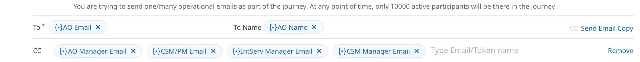 Currently there is a limit of three email addresses that are able to be cc’d in Journey Orchestrator programs. I would love to see this number either expanded or uncapped as we have comms. (specifically account transitions) where we want to copy 5+ different users on the emails to clients.