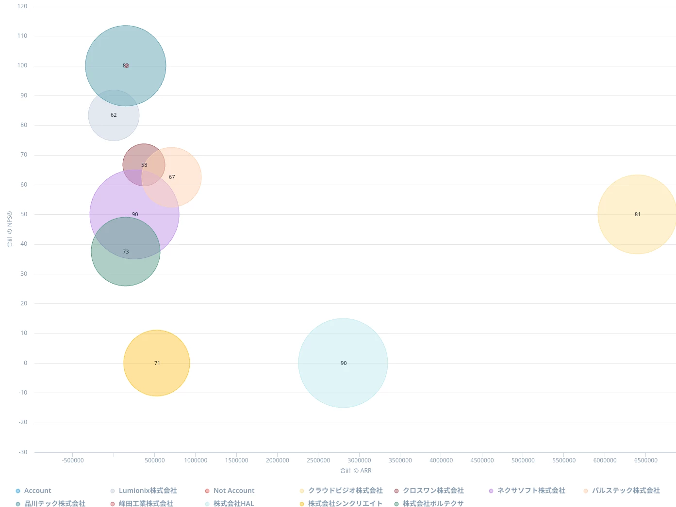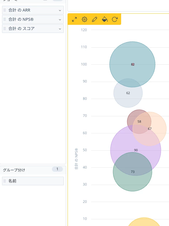 レポートで、カンパニーやリレーションシップなど、バブルを作りたい単位でグループして頂き、