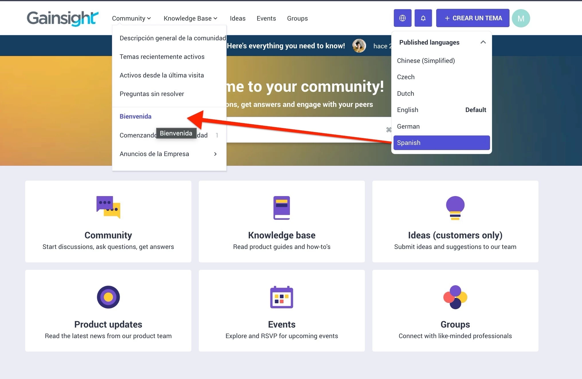 For example, you create a new Community category specifically for Spanish-speaking users to help them get started.