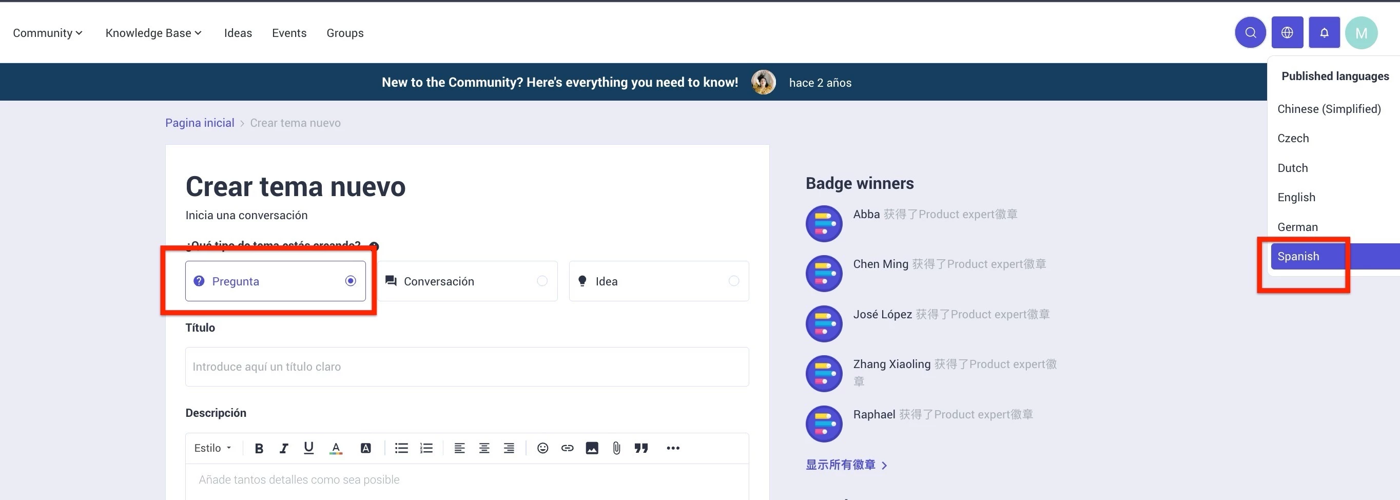 Additionally, community users can post language-specific questions from Destination. To post a question in Destination:
