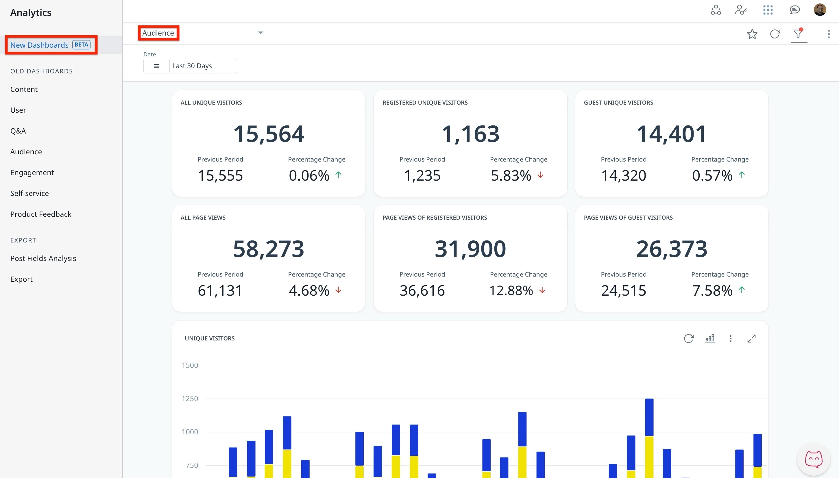 Through core metrics such as unique visitors, page views, and visitor types (registered vs. guest), the dashboard delivers a comprehensive view of audience composition and interaction patterns. Change indicators highlight shifts in performance across periods, helping teams detect emerging trends and assess the impact of campaigns or content updates.