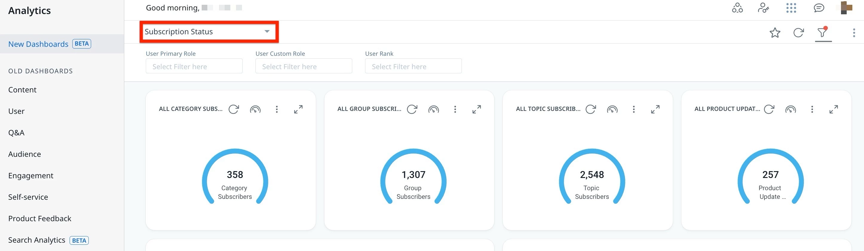 The Subscription Status dashboard is an out-of-the-box (OOB) dashboard that can be viewed from the Analytics page.