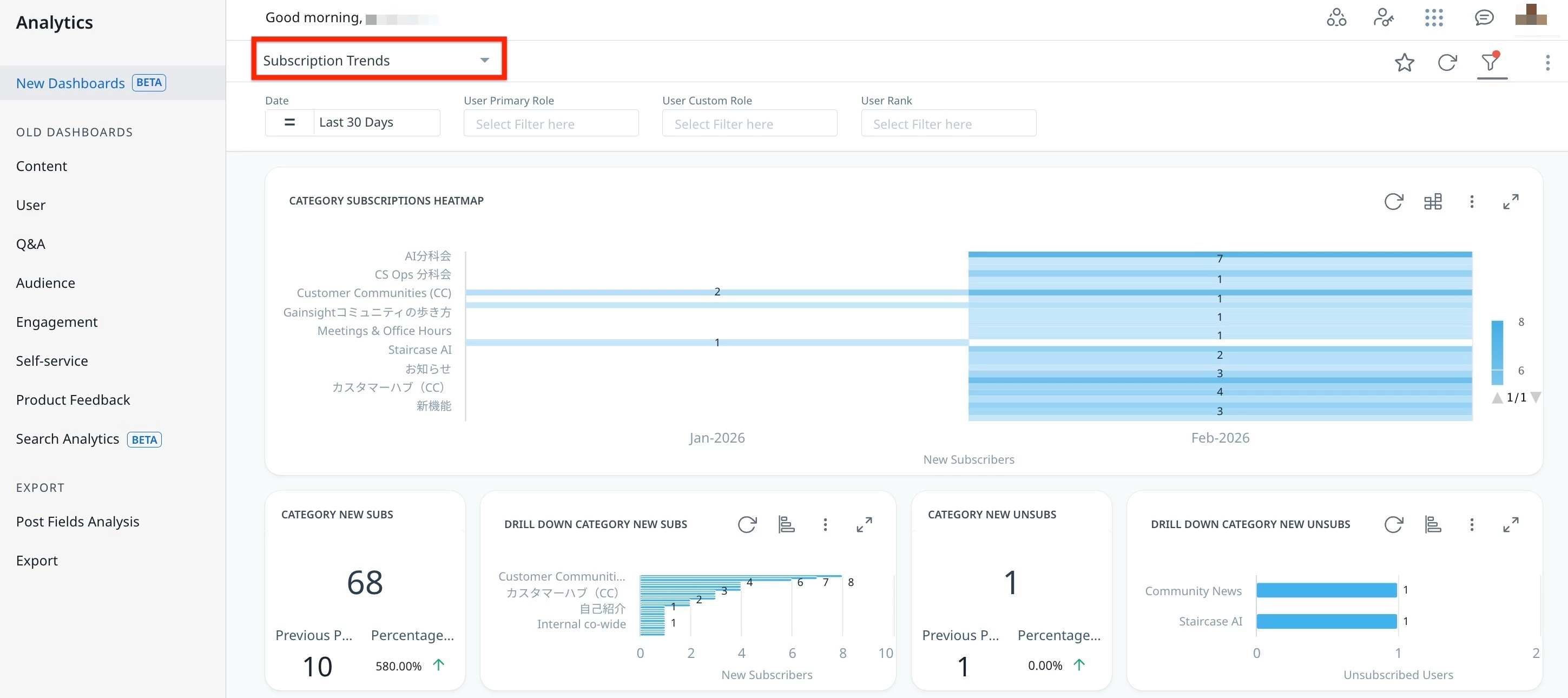 The Subscription Trends dashboard provides insights into community subscription activity. It helps community managers, product teams, and engagement analysts track subscriptions and unsubscriptions across categories, groups, topics, and product updates using key metrics and filters.