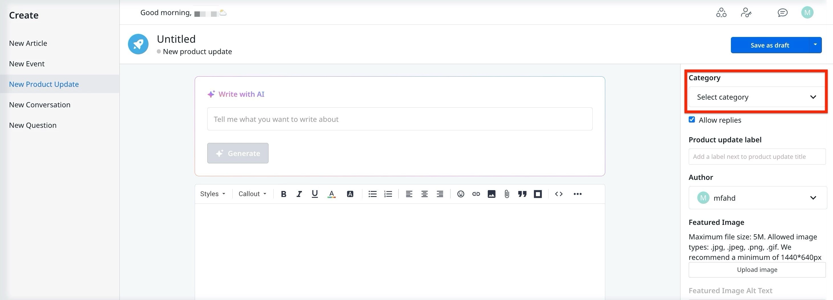 Each Product Update can be created within a specific Community Category, allowing users to view updates grouped by relevant themes or product areas.